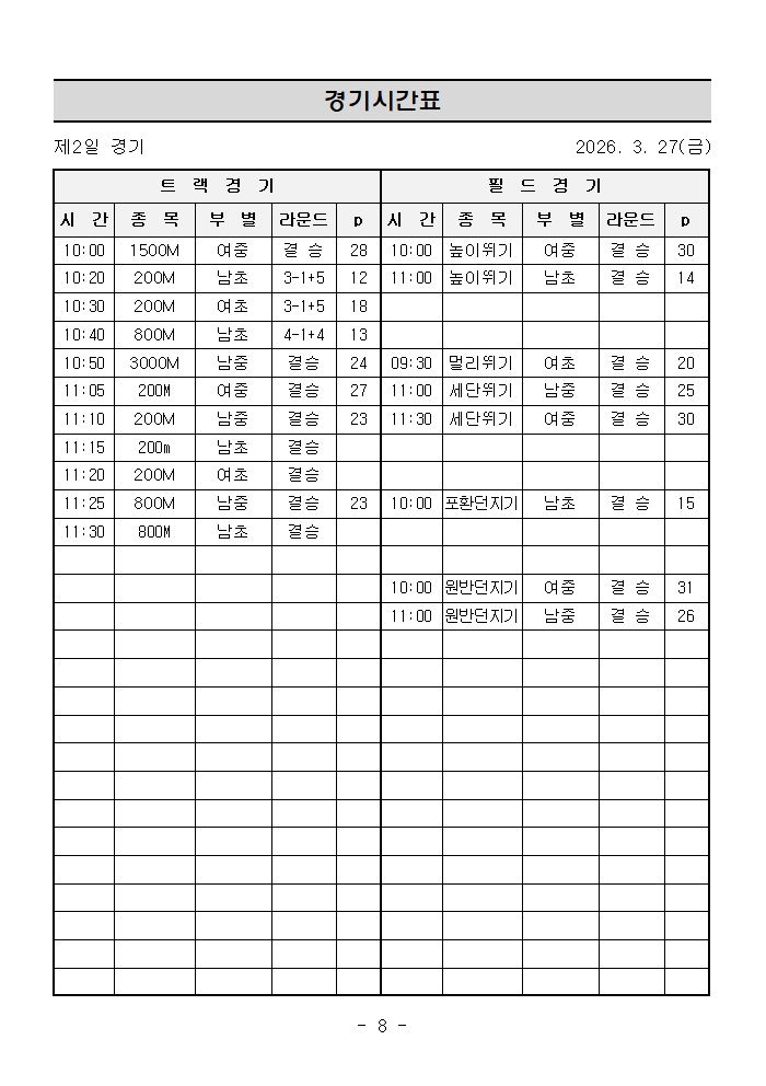 제55회 전국소년체육대회 전북 대표 선발전 경기시간표 페이지 정보 작성자 전북육상연맹 댓글 0건 조회 78회 작성일 26-03-19 09:58 본문 붙임파일 참고해주세요. 목록 다음글제37회전북역전마라톤대회 구간별 오더용지 25.10.28 댓글목록 댓글목록 등록된 댓글이 없습니다.